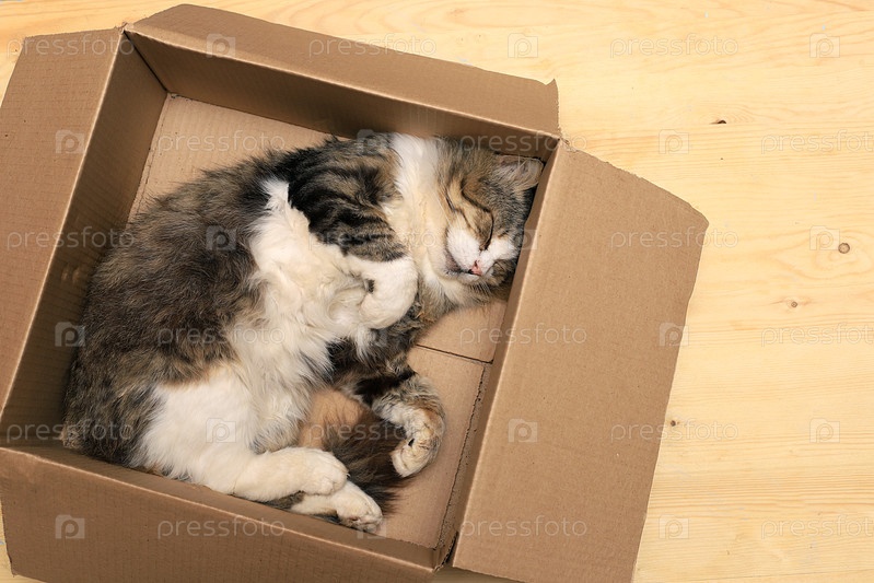 Пушистый спящий кот в картонной коробке на светлом полу дома, вид сверху