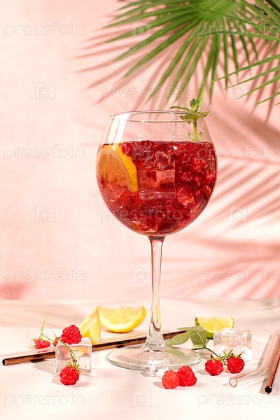Королевский лимонадный коктейль с текилой, джином, ромом, водкой, льдом и свежей малиной, концепция бара и вечеринки, рекламная открытка ресторана и кафе, элегантный фон, выборочный фокус