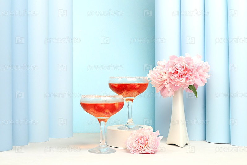 Концепция летней вечеринки и праздника. Рекламная открытка для бара или меню с праздничными бокалами красного мартини на элегантном модном столике с пионами. Приглашение в рестораны и кафе