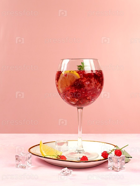 Королевский лимонадный коктейль с текилой, джином, ромом, водкой, льдом и свежей малиной, концепция бара и вечеринки, рекламная открытка ресторана и кафе, элегантный фон, выборочный фокус