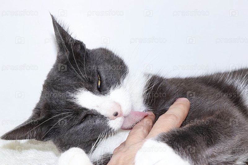 Крупный план домашней кошки, моющей человеческую руку, уютный дворовый кот нашел свой дом, спасение животных, любовь и преданность наших питомцев