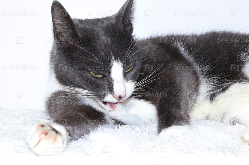 Крупный план домашнего кота, моющего свою шубу, уютный дворовый кот нашел свой дом, спасение животных, любовь к нашим питомцам