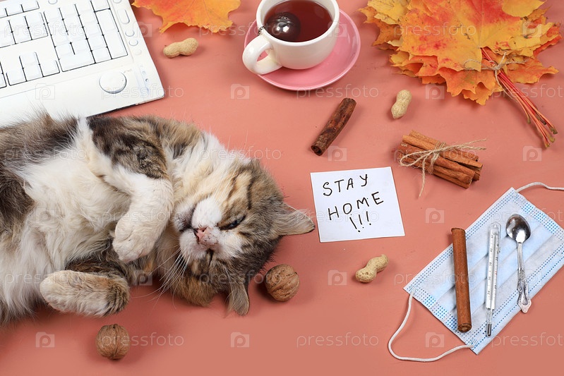 Осенняя композиция flat lay, компьютер, чай, маска и спящий кот, удаленная работа, минимальная бизнес-концепция. Современный рабочий стол для женщин. Домашний офис в пандемию, оставайтесь дома