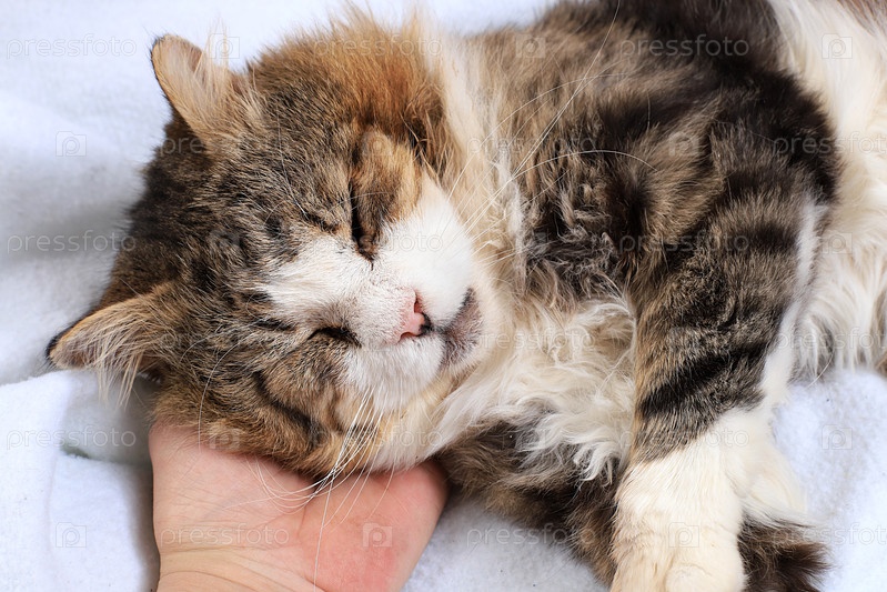 Крупный план спящего кота на руке человека, уютный дворовый кот нашел свой дом, концепция дружбы и любви к домашним животным, выборочный фокус