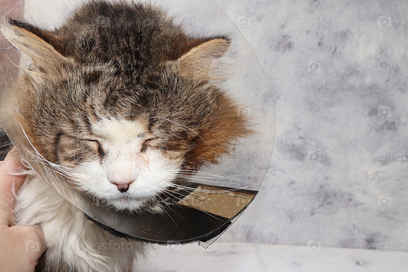 Старый больной кот в медицинском воротнике на сером столе. Концепция спасения бездомных животных. Каждый питомец должен иметь право на лечение и жизнь