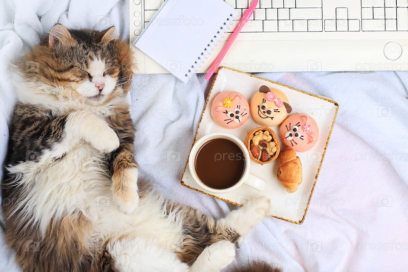 Современный рабочий стол для женщины, уютный домашний офис с кошкой. Кофе латте и кексы на легком одеяле, здоровый образ жизни, идеальное уютное утро, плоская планировка, выборочный фокус