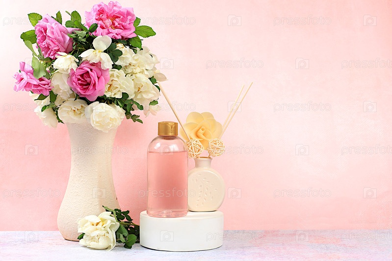 Спа и велнес композиция с розовой водой, ароматическими палочками и свежими цветами роз, концепция естественного ухода за собой и здорового образа жизни, рекламная карточка спа-салона с местом для текста. композиция с цветами