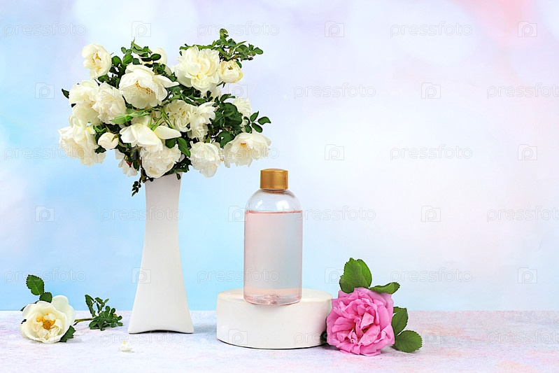 Спа и велнес композиция с розовой водой и свежими цветами роз, концепция естественного ухода за собой и здорового образа жизни, рекламная карточка спа-салона с местом для текста. композиция с цветами