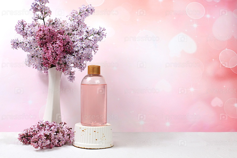 Рекламная карточка спа-салона с местом для текста. Спа и велнес-композиция с сиреневой водой и свежими сиреневыми цветами, концепция естественного ухода за собой и здорового образа жизни, композиция с цветами