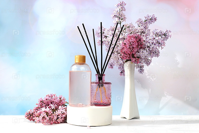 Рекламная карточка спа-салона с местом для текста. Спа и велнес-композиция с сиреневой водой, ароматическими палочками и свежими цветами сирени, концепция естественного ухода за собой и здорового образа жизни, композиция с цветами