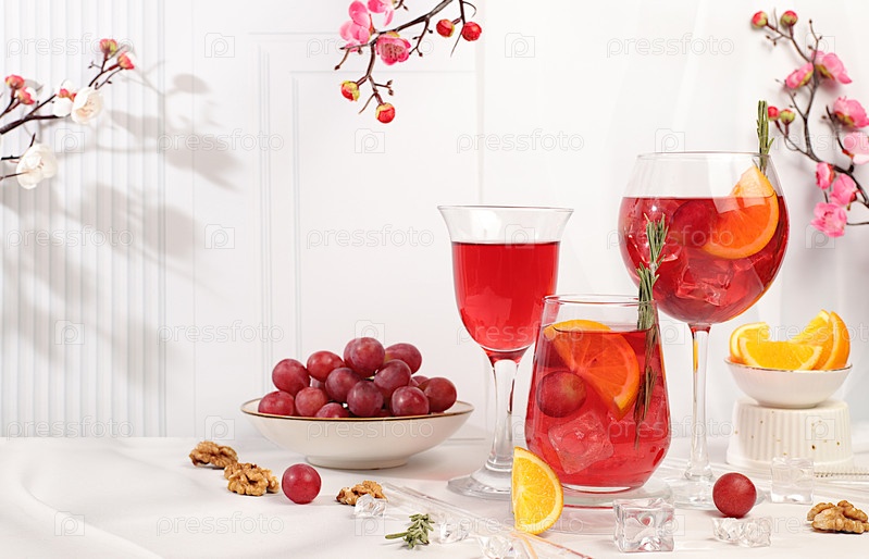 Бокалы с виноградным коктейлем, красным вином и соком с виноградными ягодами, льдом и дольками цитрусовых на элегантном фоне с весенними цветами сакуры, концепция бара и летней вечеринки, рекламная карточка ресторана и кафе