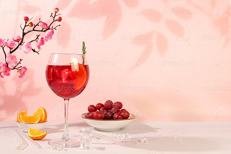 Королевский лимонадный коктейль с текилой, джином, ромом, льдом и виноградом, концепция бара и вечеринки, рекламная открытка ресторана и кафе, элегантный фон с весенними цветами сакуры, селективный фокус