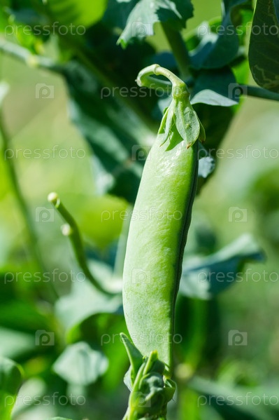 Макро выращивания гороха в поле, Спелый свежий зеленый горошек на органической ферме, Зеленый горошек висит на растении