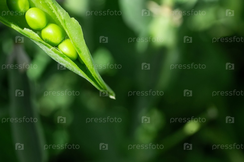 Макро выращивания гороха в поле, Спелый свежий зеленый горошек на органической ферме, Зеленый горошек висит на растении