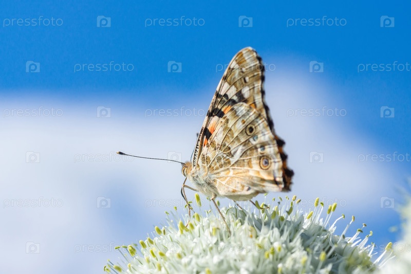 Репейница, или чертополоховка (лат. Vanessa cardui) дневная бабочка на луковом цвете на фоне неба