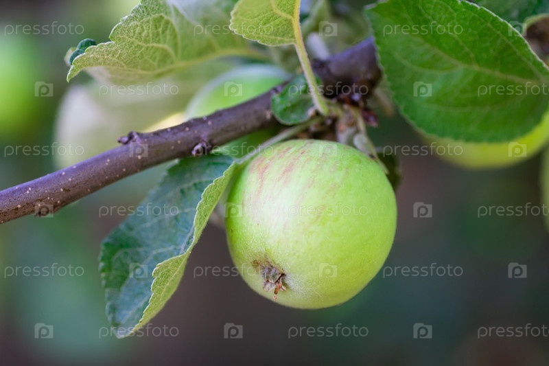 Экологически чистые яблоки. Зеленые яблоки на дереве. красивые яблоки созревают на ветке в лучах солнца