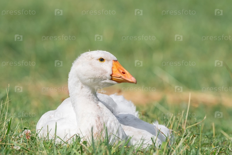 Вид сбоку на белого гуся, стоящего на зеленой траве