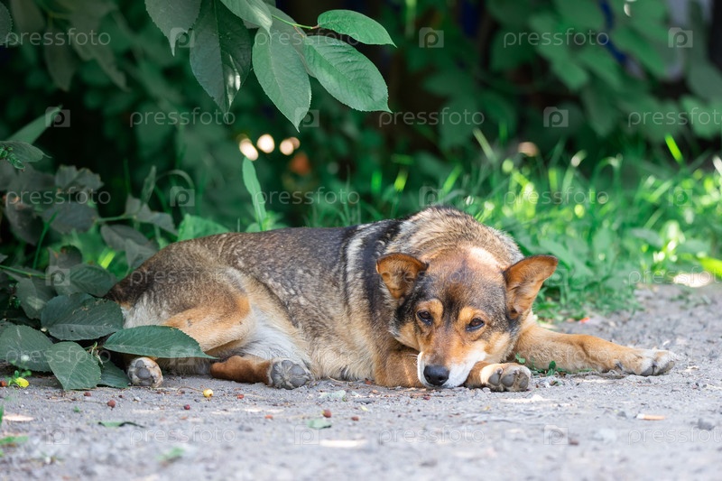Дворняга рыжего окраса лежит на животе на траве, вытянув передние лапы вперед. Весна, лето