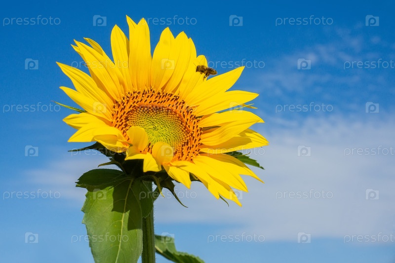 Красивый пейзаж с одним подсолнечником над голубым небом. Пчела летит к цветку. Концепция природы