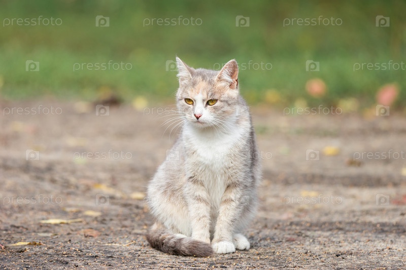 Серый полосатый кот гуляет на улице
