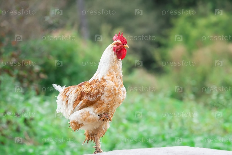 Милый петух кричит на ферме