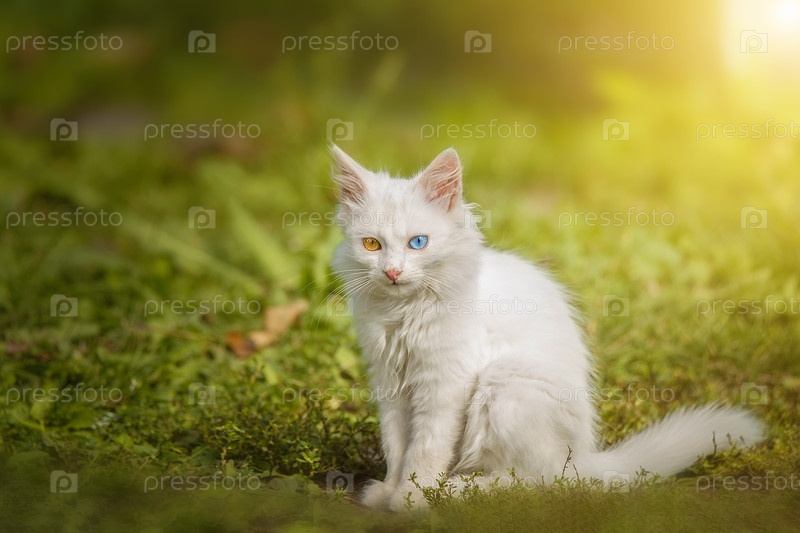 Маленький белый котенок британской кошки сидит на траве. Гетерохромия (разные глаза)