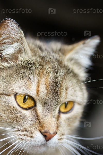 Серый полосатый кот гуляет на поводке по зеленой траве на улице