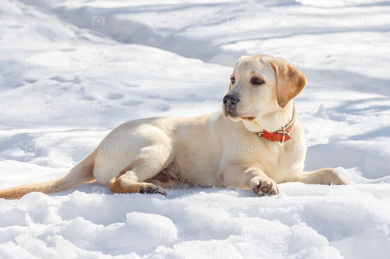 Молодой лабрадор наблюдает за зимними угодьями в природе