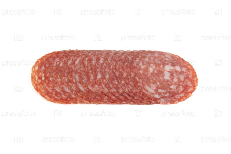 Копченые ломтики колбасы. Изолированные на белом фоне. Крупный план