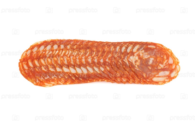 Копченые ломтики колбасы. Изолированные на белом фоне. Крупный план