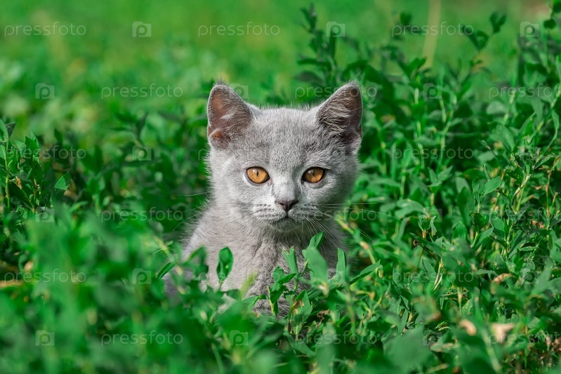 Маленький милый серый пушистый котенок на улице. Первые шаги котенка