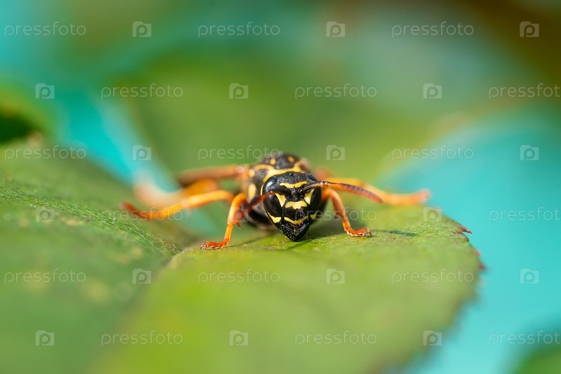 Оса сидит на зеленых листьях. Опасная желто-черная полосатая оса сидит на листьях