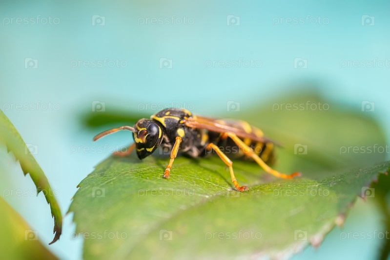 Оса сидит на зеленых листьях. Опасная желто-черная полосатая оса сидит на листьях