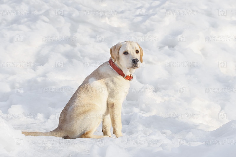 Молодой лабрадор наблюдает за зимними угодьями в природе