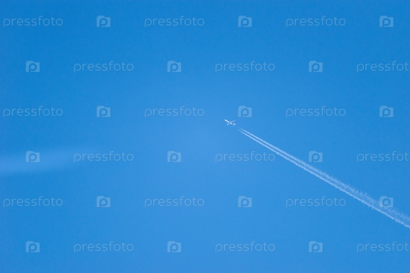 След самолета в синем небе