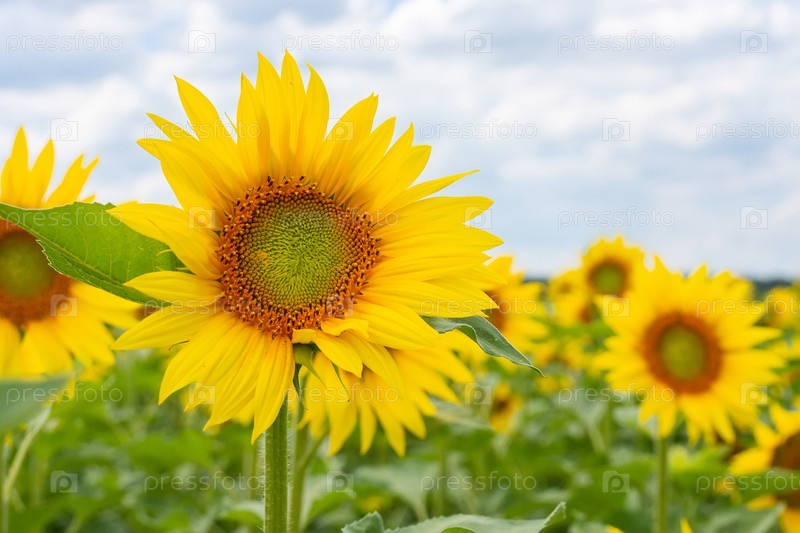 Красивый пейзаж с полем подсолнечника над голубым небом. Концепция природы