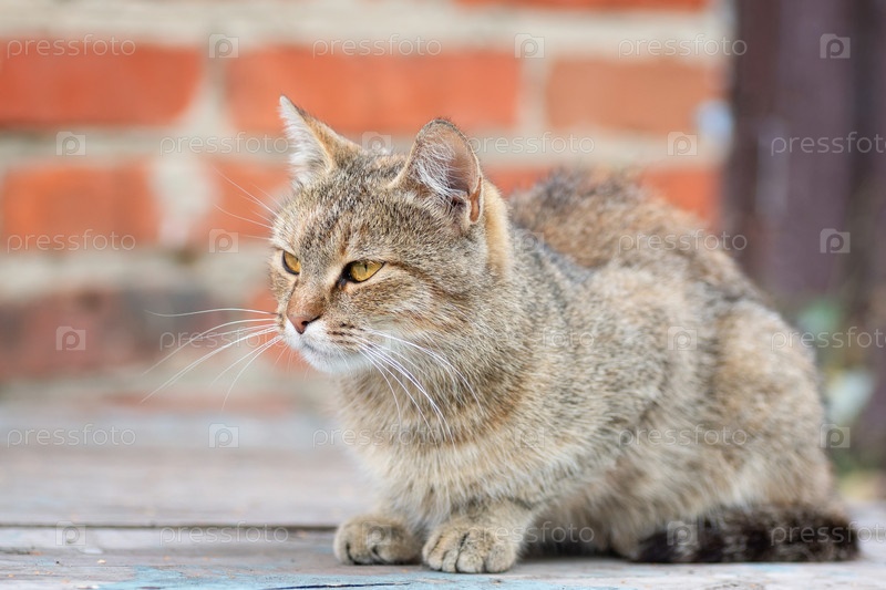 Серый полосатый кот гуляет на поводке по зеленой траве на улице