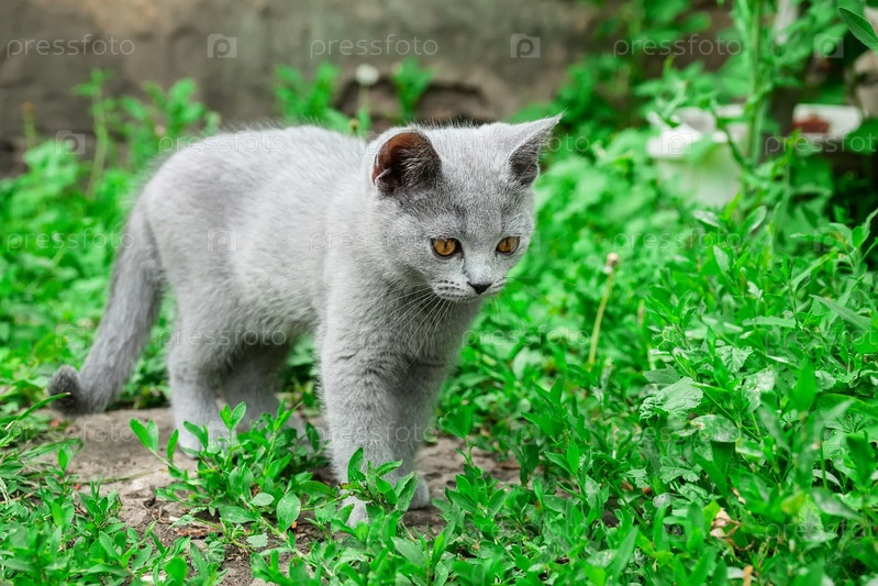 Маленький милый серый пушистый котенок на улице. Первые шаги котенка