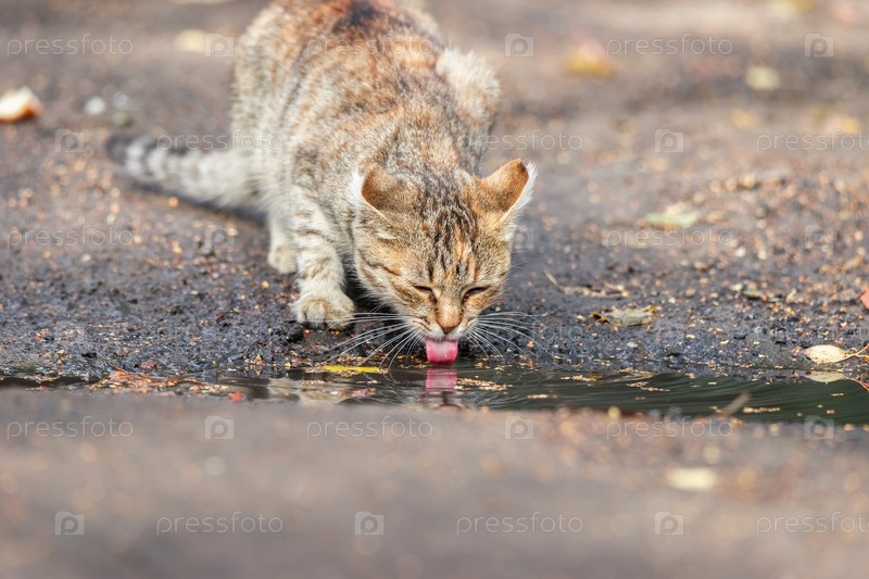 Серый полосатый кот гуляет на поводке по зеленой траве на улице