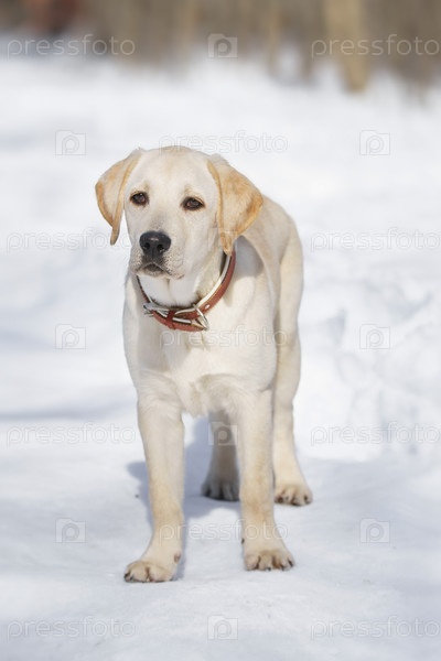 Молодой лабрадор наблюдает за зимними угодьями в природе
