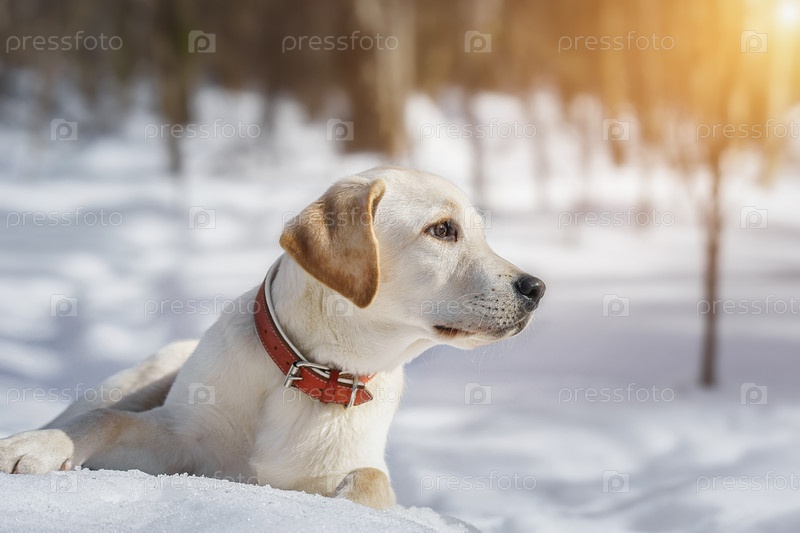 Молодой лабрадор наблюдает за зимними угодьями в природе