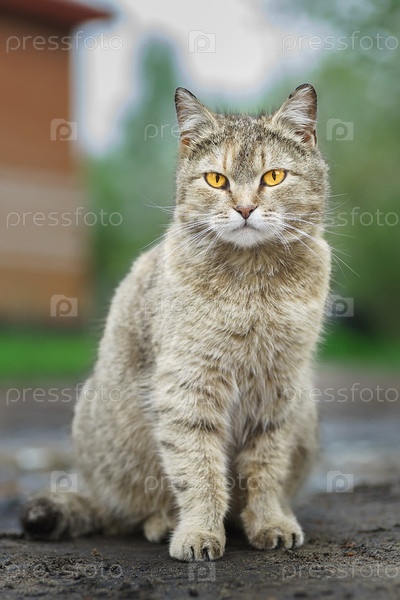 Серый полосатый кот гуляет на улице