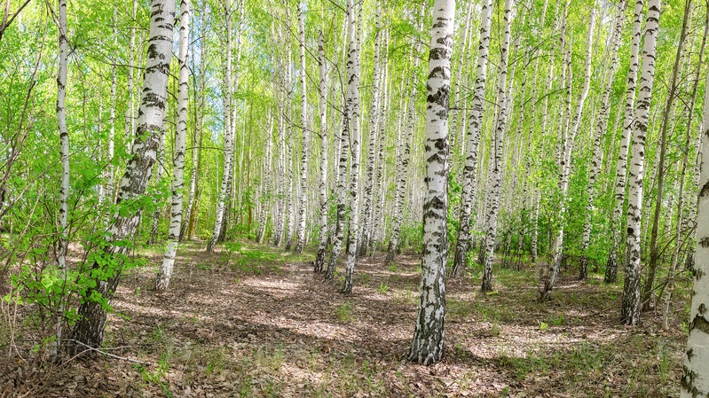 Красивый осенний живописный пейзаж с березовой рощей. Березовый лес. Березовая роща. Белые стволы берез