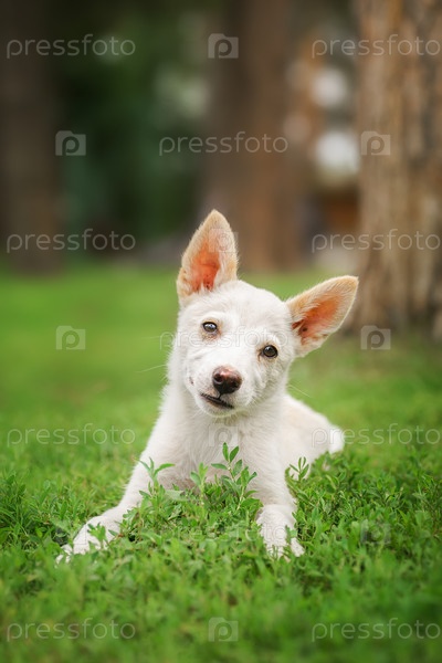 Милый и внимательный белый щенок сидит в сочной зеленой траве