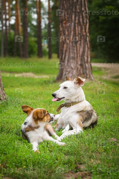 Милый и внимательный белый щенок сидит в сочной зеленой траве