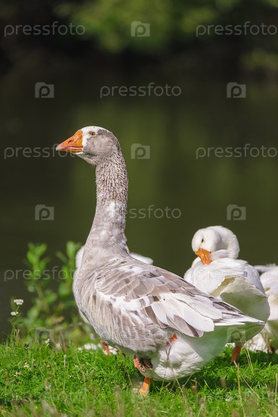 Солнечный летний пейзаж с домашними гусями на лугу. Гуси пасутся на зеленой траве
