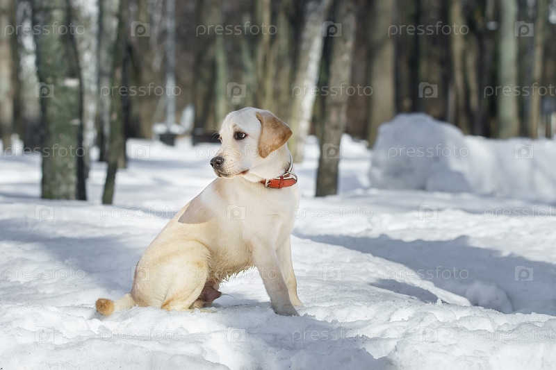 Молодой лабрадор наблюдает за зимними угодьями в природе