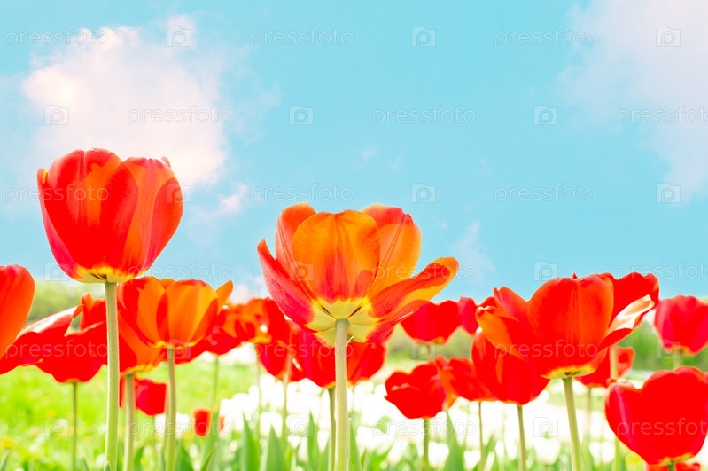 Красные тюльпаны на клумбе на фоне голубого неба. Красные тюльпаны посажены в саду