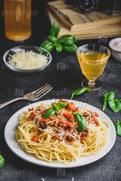 Спагетти с соусом болоньезе, пармезаном и базиликом