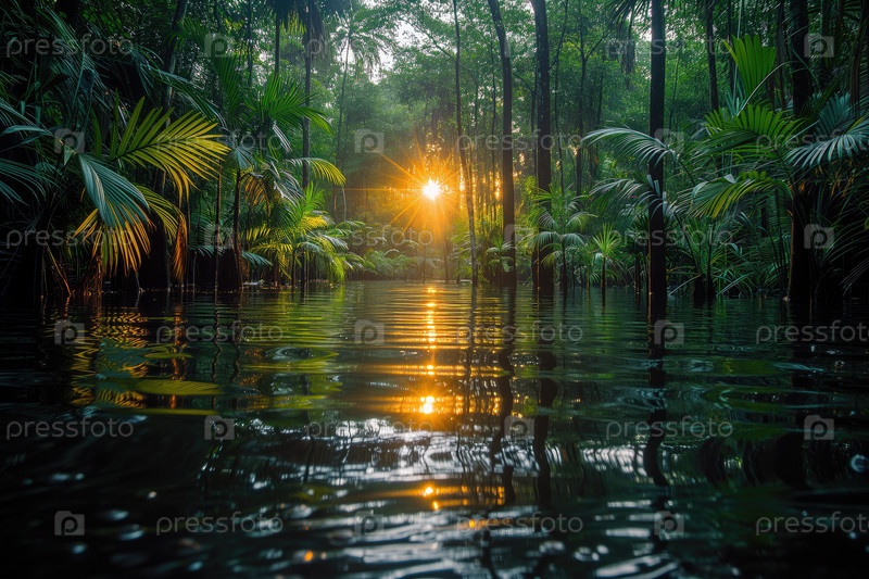 Восход солнца в затопленном тропическом лесу во время сезона половодья